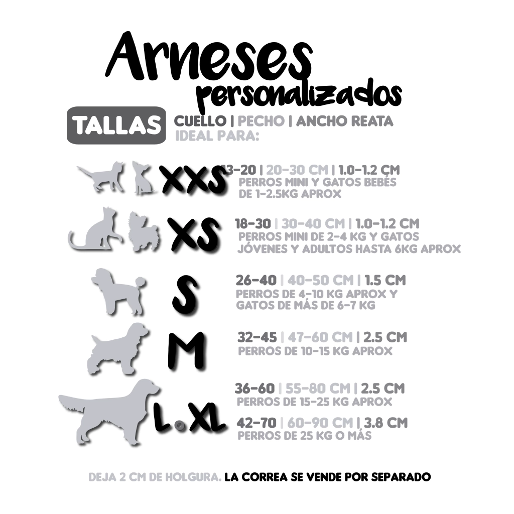 Aquí elige la talla y si llevas correa o no. El diseño step-in ejerce presión sobre la parte baja del cuello, protegiendo la tráquea y el clásico sobre parte alta del cuello y pecho (más seguro para gatos). Podrás ingresar el diseño, posibles variaciones y los datos de marcación aquí o también antes de hacer el pago. Usaremos alguno de los colores predominantes del diseño para la parte posterior.